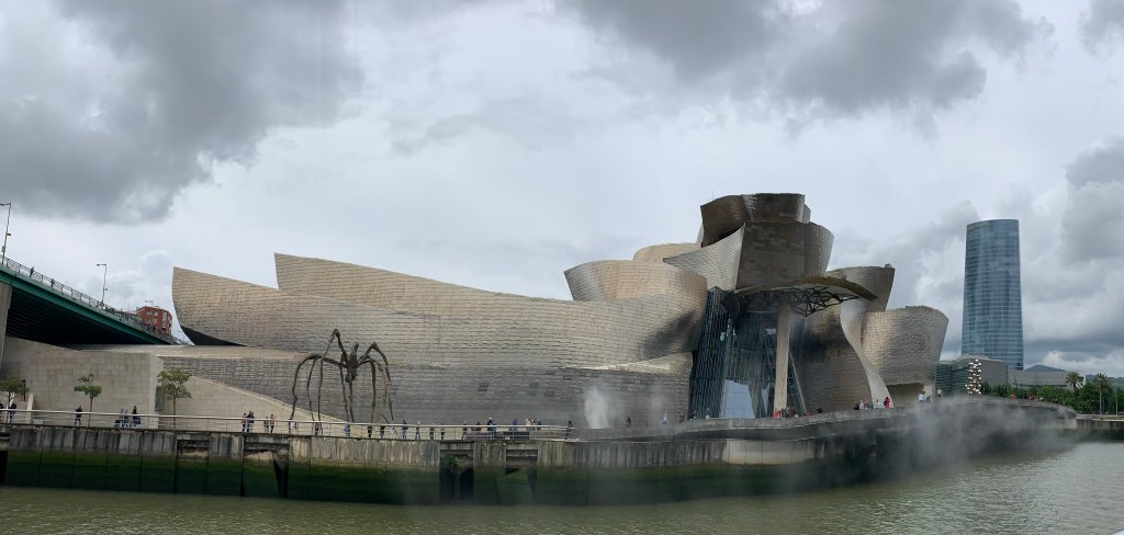 As we taxied from the Bilbao-Loiu Airport, each lost in our own thoughts and taking in the sights of a new city, we came down a hill, turned a corner, and there it was. I’d love to say the masterpiece structure constructed of titanium, limestone, and glass, stood in contrast to the deep azure blue sky, reflecting the bright afternoon sun…but alas, it was a cloudy, overcast day. However, even without the beaming sun and blue sky, this was a sculpture (not simply a structure), that held its own, rain or shine.